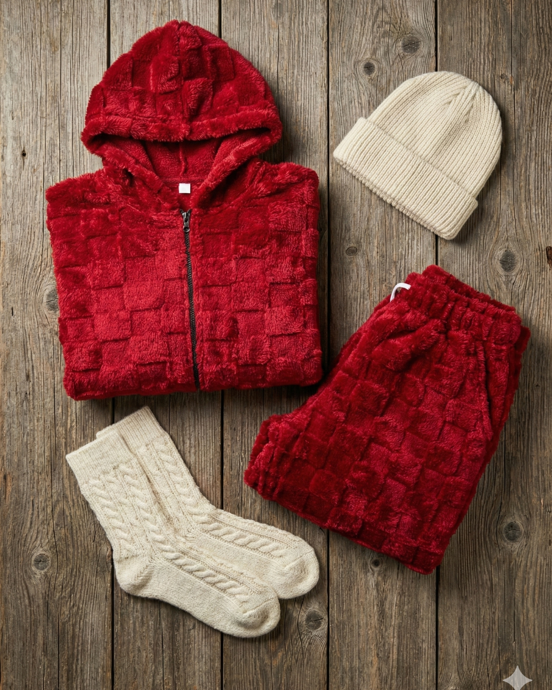 Stay warm from head to toe with this ultra-soft plush hoodie set. Cozy hood, warm pockets, and full-zip design for easy wear. Perfect for winter lounging, Netflix marathons & chilly mornings.