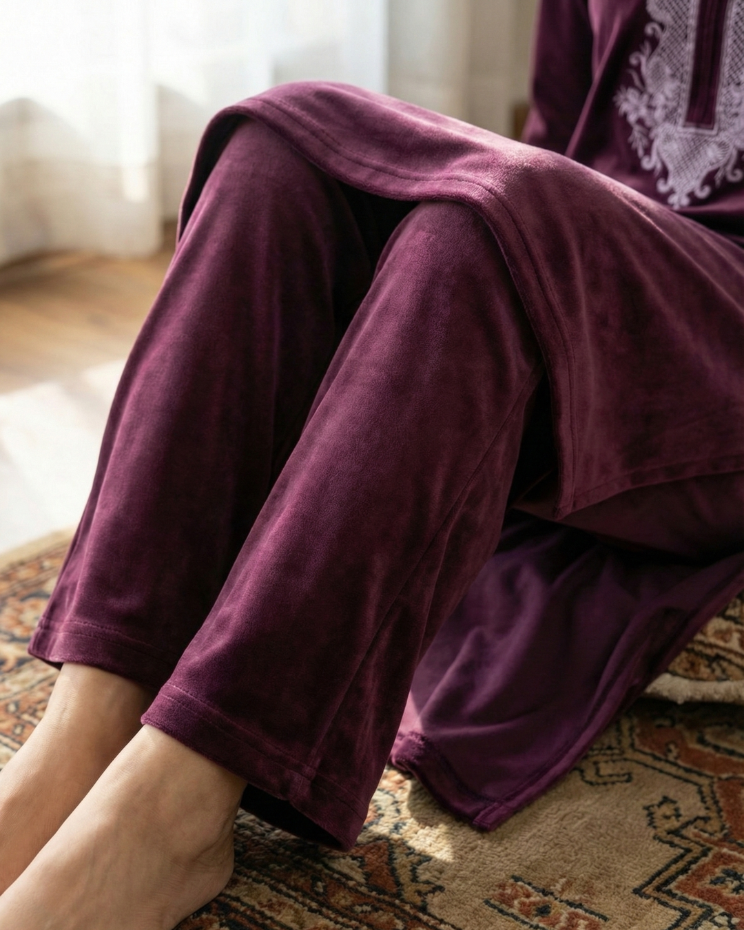 Crafted from rich premium velvet, this winter kurti set adds a royal touch to your wardrobe. The intricate neckline embroidery enhances its timeless style, while the plush fabric feels incredibly gentle on skin. Stay stylish, snug, and effortlessly graceful through the season.