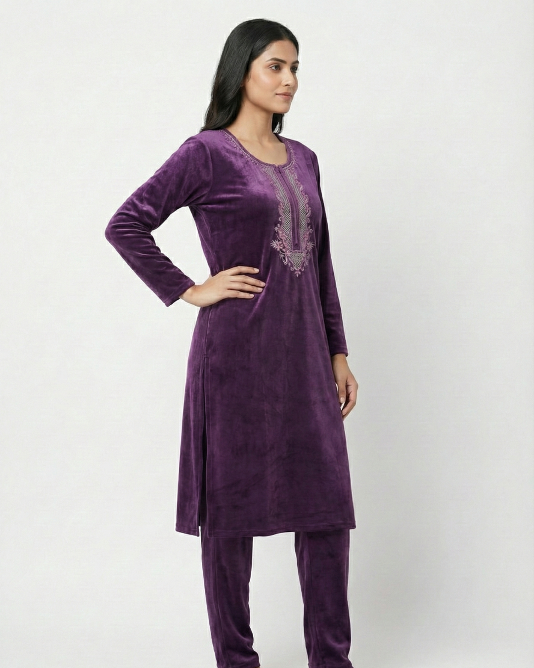 Crafted from rich premium velvet, this winter kurti set adds a royal touch to your wardrobe. The intricate neckline embroidery enhances its timeless style, while the plush fabric feels incredibly gentle on skin. Stay stylish, snug, and effortlessly graceful through the season.