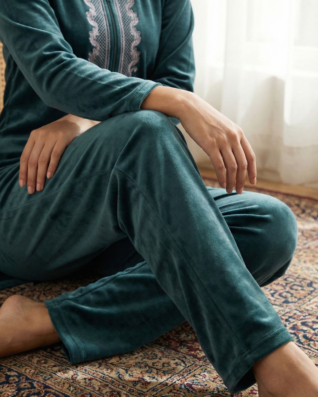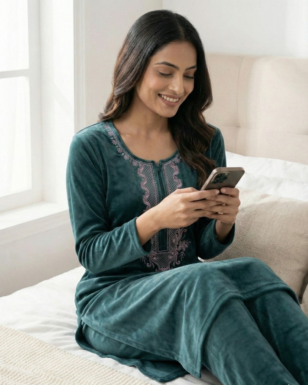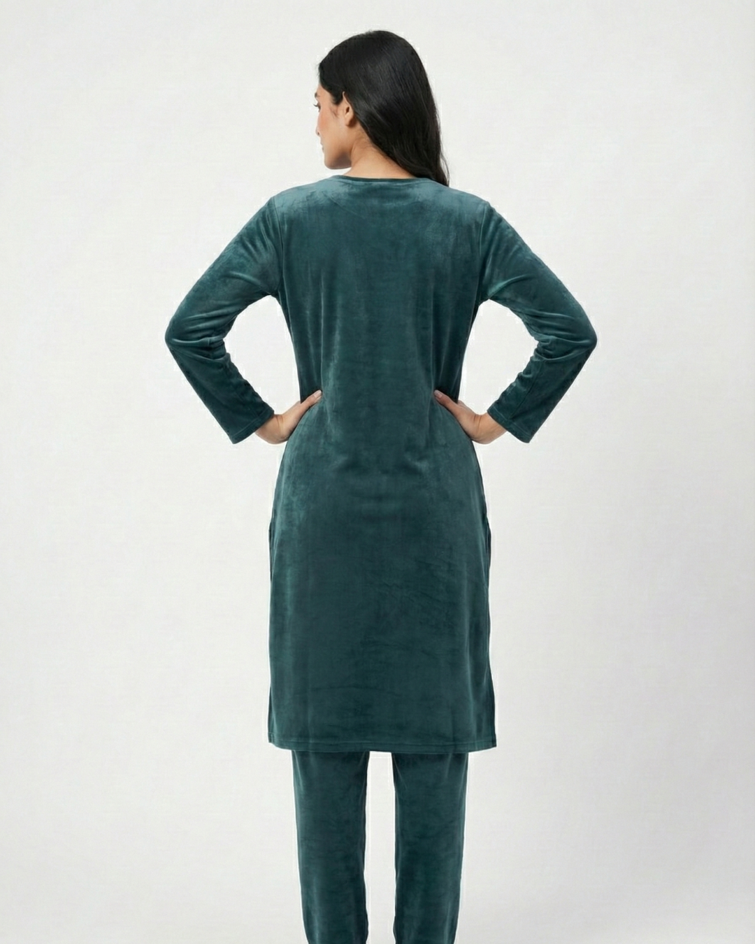 Crafted from rich premium velvet, this winter kurti set adds a royal touch to your wardrobe. The intricate neckline embroidery enhances its timeless style, while the plush fabric feels incredibly gentle on skin. Stay stylish, snug, and effortlessly graceful through the season.